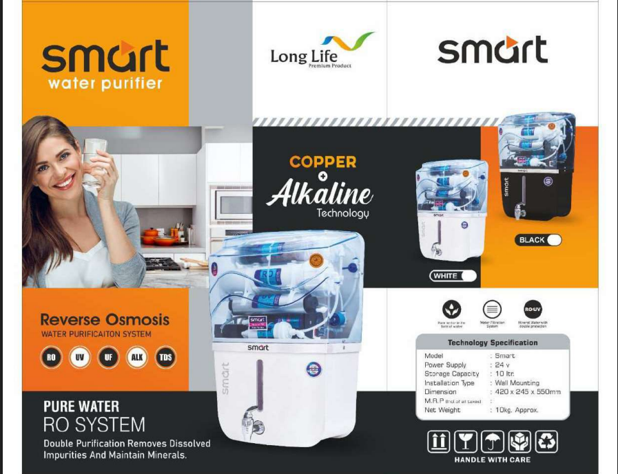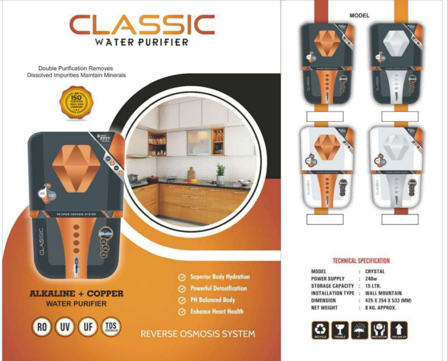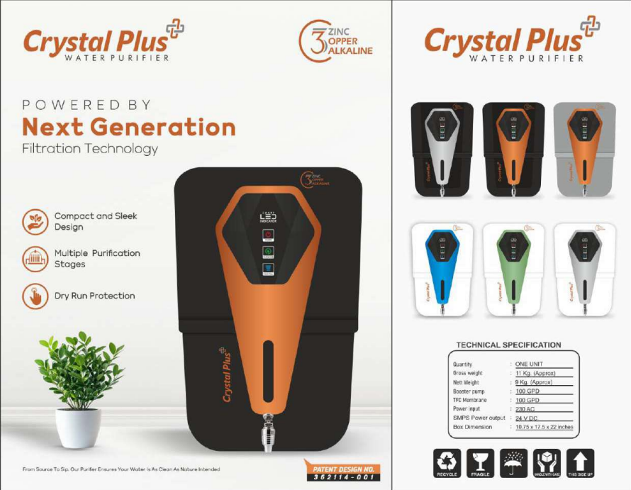 Crystal Plus Water Purifier with a high-quality RO cabinet designed for long term use, offering an attractive design and strong build for long-term use. Available in multiple colors and finishes, suitable for all standard RO fittings and setups.
